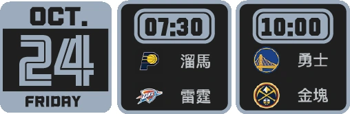 上午 7:30 由印第安納溜馬作客挑戰奧克拉荷馬雷霆,哈利伯頓對上亞歷山大的控衛頂尖對決,速度與創造力將決定勝負。