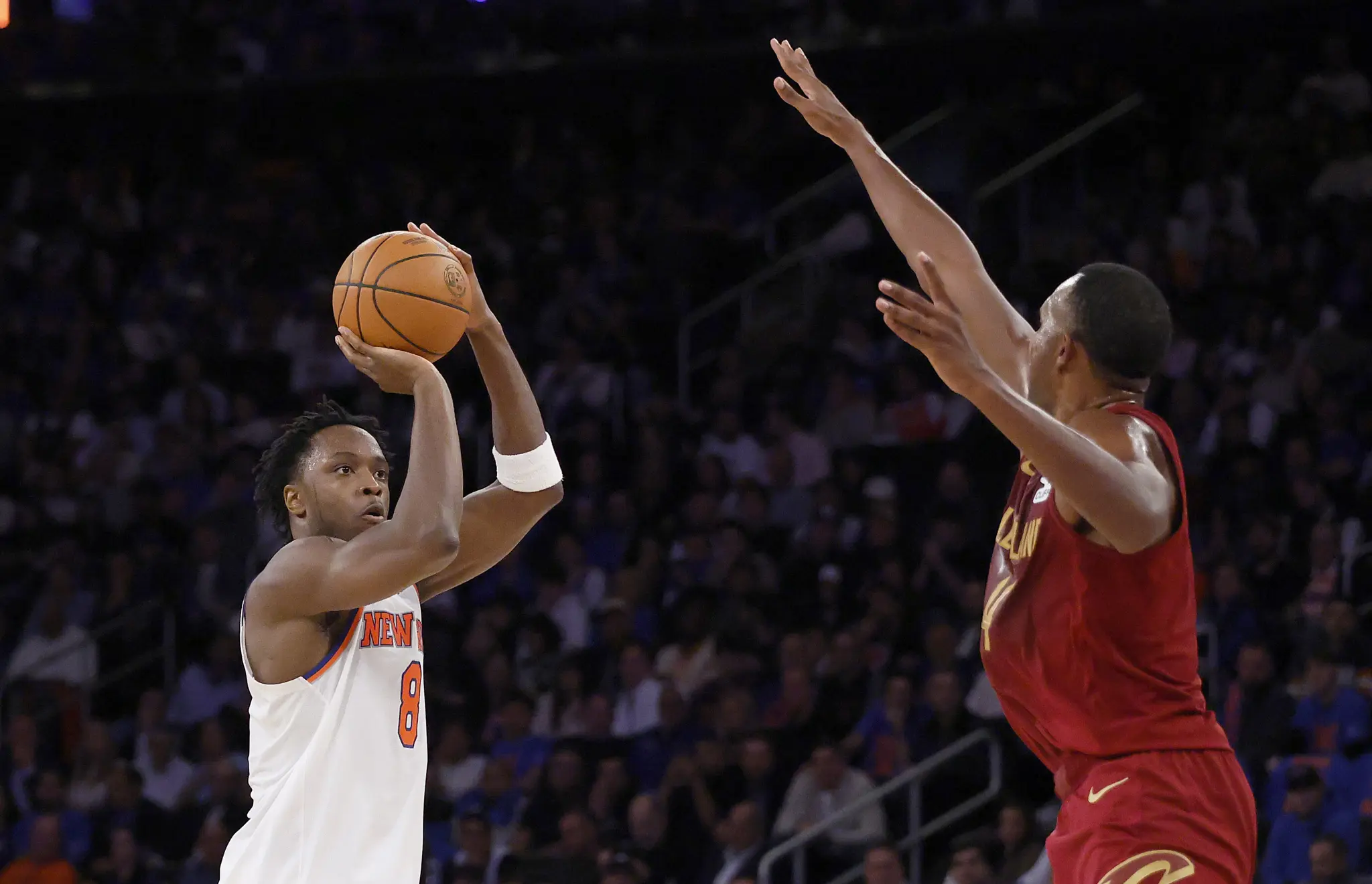紐約的主場總有一種獨特的張力。開場不久,騎士的多諾萬·米契爾就以連續外線命中打破僵局,他的節奏穩定而侵略性十足,一度讓克里夫蘭掌握主導權。尼克則以布倫森的穩定控場應對,他不急於追分,而是持續壓迫對方防線,為隊友創造空檔。上半場結束時雙方只差三分,麥迪遜花園廣場的氣氛像是準備爆發的火山。