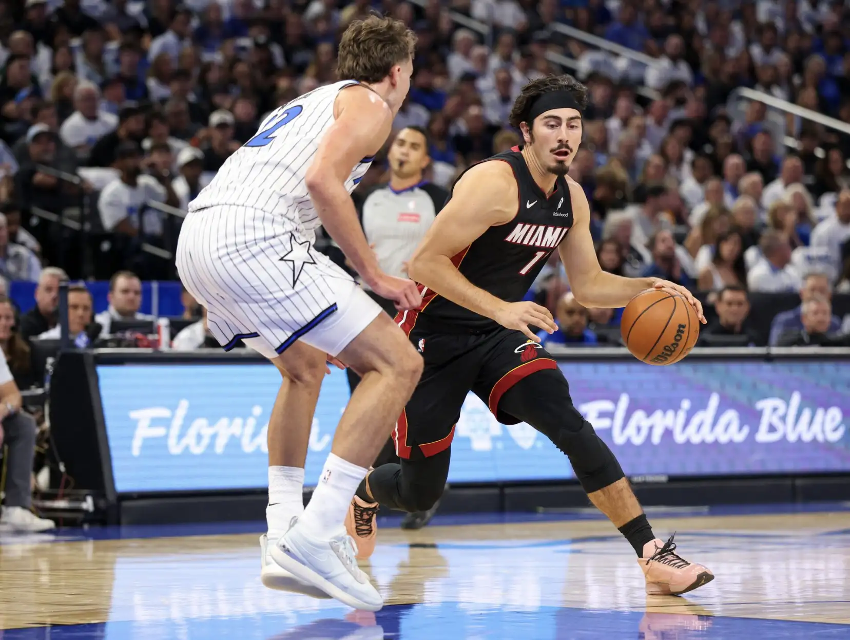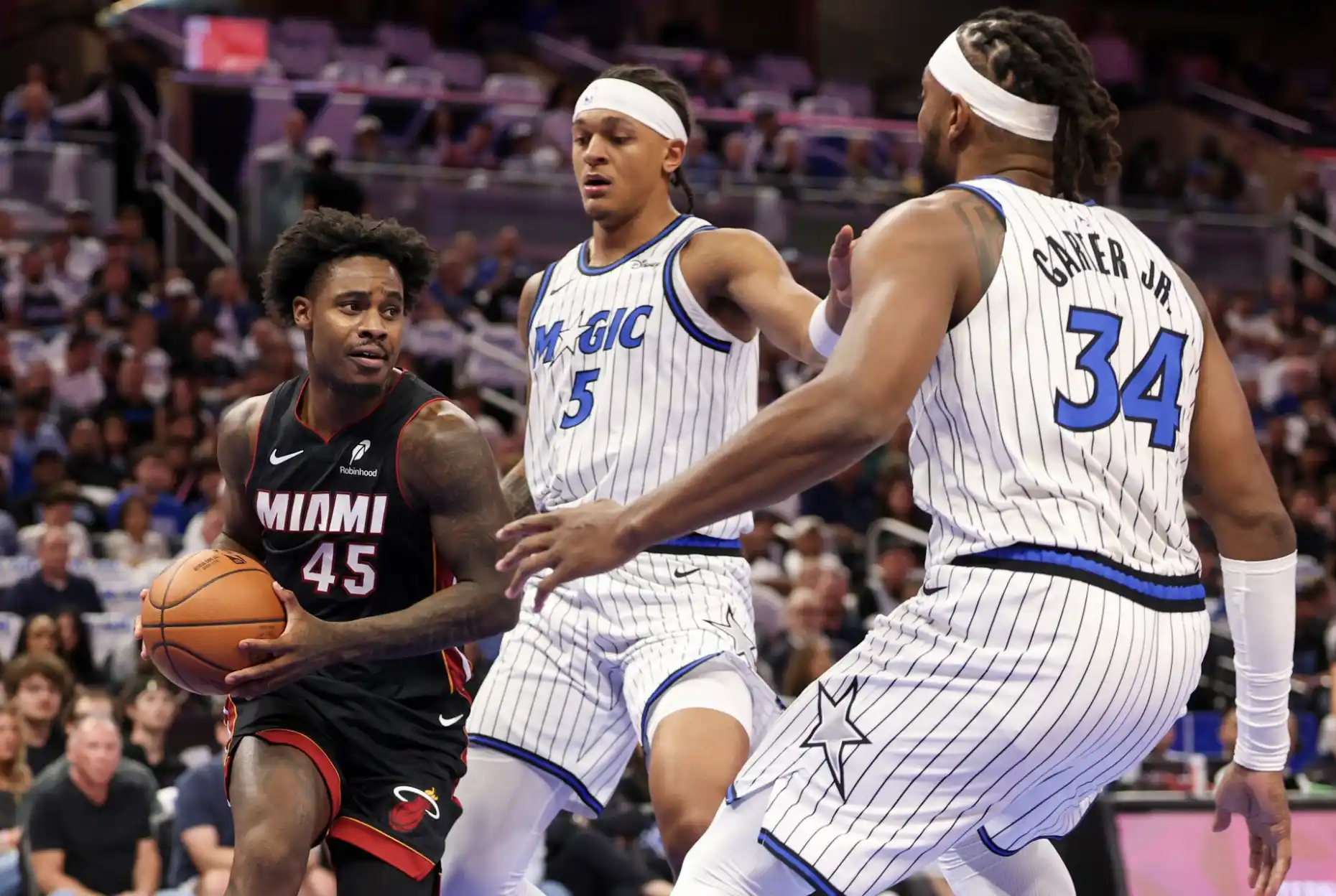 佛州德比從來不缺火藥味。開場熱火打得沉穩,巴特勒在高位穩定取分,阿德巴約的擋拆配合讓魔術的防守一度混亂。邁阿密以老練的節奏掌控上半場,但魔術並沒有被擊垮。年輕的班凱羅在禁區強打連續得手,瓦格納與薩格斯在外線開火,讓分差始終保持在可追範圍內。