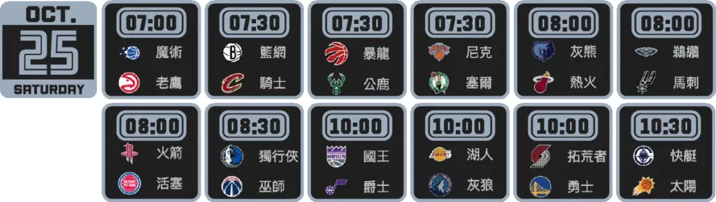 在經歷前一晚雙加時與延長賽的高潮戲碼後,10 月 25 日的 NBA 賽場將迎來本季開局以來規模最大的一個比賽日,橫跨東西兩區、共 14 場賽事接連登場,幾乎囊括所有強隊與話題新秀。這一天的戰況將從清晨一路持續到深夜,為球迷帶來滿滿的籃球饗宴。