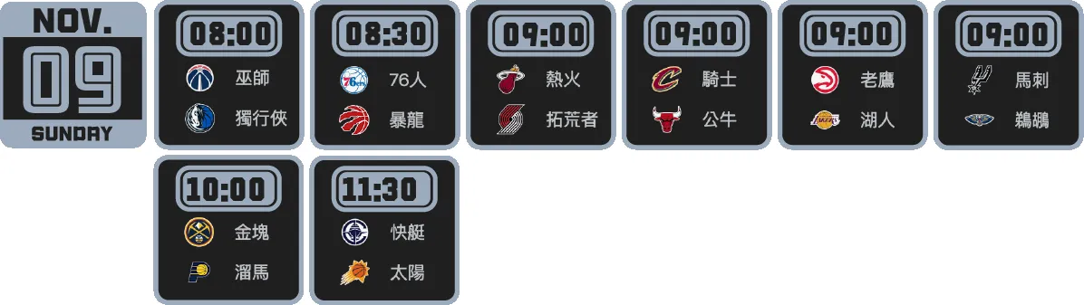 從清晨開打到中午壓軸,八場比賽接力上演,火力、節奏、話題一次滿載。球迷們請準備好觀賽清單——這個週日將是整個十一月最熱血的籃球日!