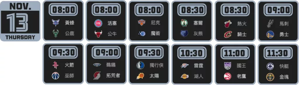 例行賽將迎來本週最密集的一天,共有 十二場比賽 熱血開打。從東區的宿敵對決,到西區的強權交鋒,幾乎每個時段都有焦點戰事。多支球隊正處於調整期或尋求連勝,而幾位明星球員則渴望用一場代表作扭轉開季的低潮。