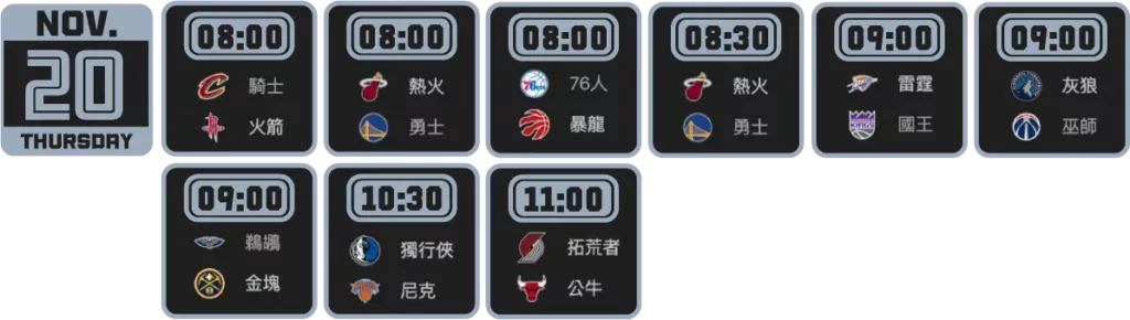 台灣時間 11 月 20 日一早,NBA 一口氣排出 8 場比賽登場,從 08:00 的騎士 vs 火箭、熱火 vs 勇士、76 人 vs 暴龍一路打到深夜的獨行俠 vs 尼克、拓荒者 vs 公牛,東西區都有關鍵對決。像是雷霆對國王、鵜鶘對金塊這種西區強隊碰頭,外加灰狼、巫師也在同一時段出賽,對接下來一週的戰績版面都可能帶來不小變化。