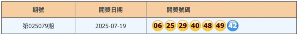 - 以期號第025079期作為範例,開獎號碼為06、25、29、40、48、49,這六個號碼便是參考號。
