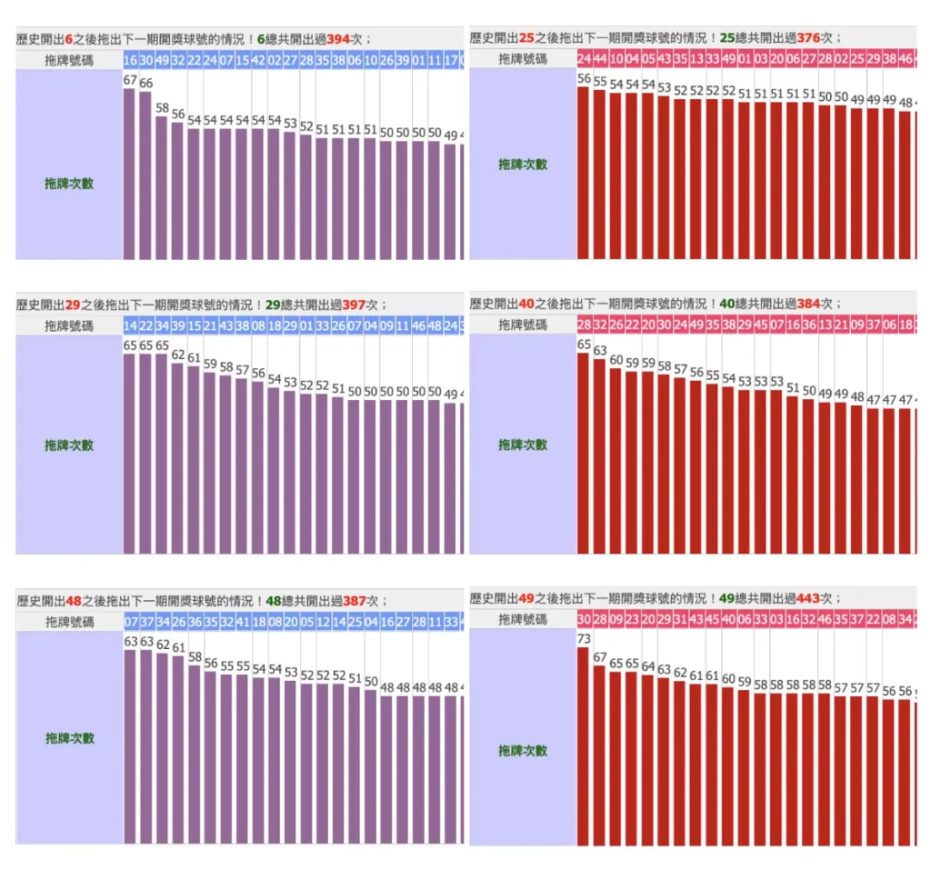 - 範例為回翻過去 2000 期,統計每次開到 06 號之後,下一期最常出現的號碼(比如 16、30)。